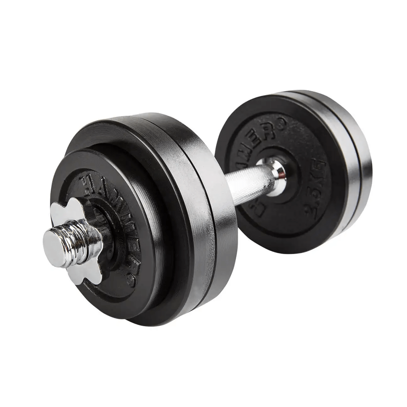 HAMMER hantlikomplekt on ideaalne valik jõutreeninguga alustamiseks. Treenimist saab kohe kodus alustada ning teha erinevaid harjutusi, nagu õlatõsted, külgtõsted ning intensiivsed biitsepsi- ja triitsepsikõverdused. Kettad kinnitatakse turvaliselt tähekujulisest kinnitistest kraedega, mis tagavad kindla lukustuse. Libisemiskindla kangi läbimõõt on 30 mm.
